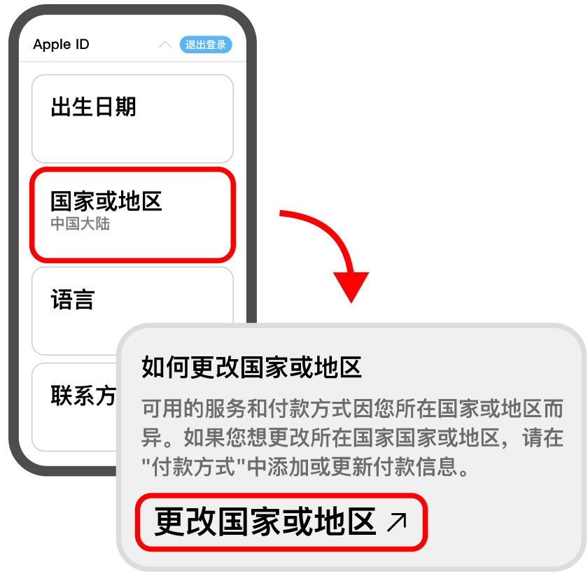 在个人信息页面选择 <国家或地区>,接着选择 <更改国家或地区>